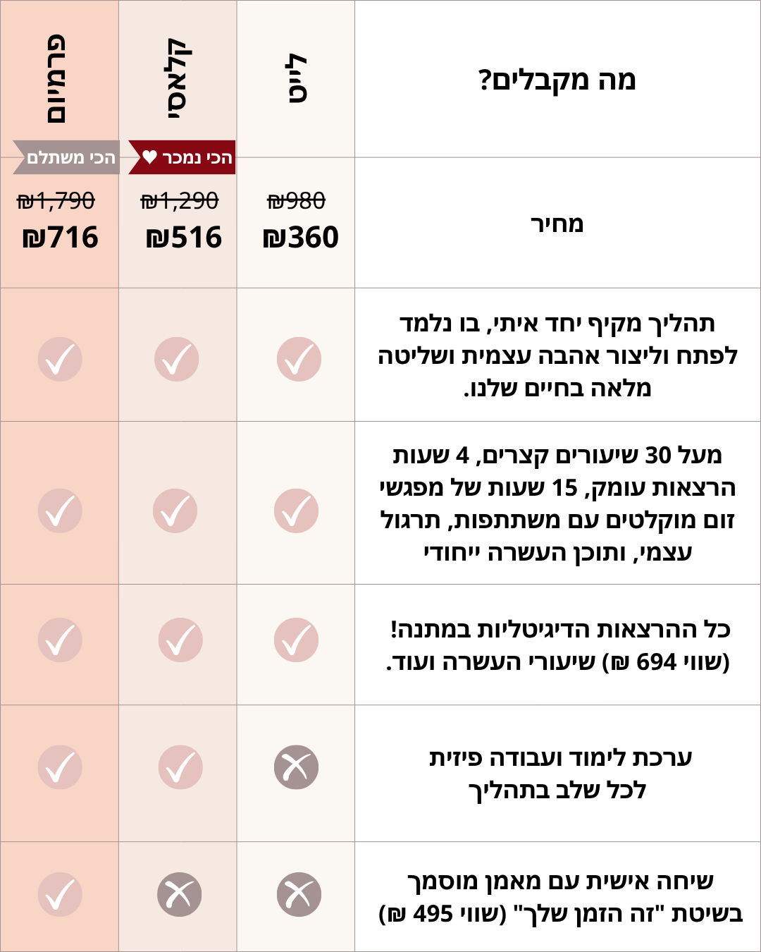 חיבור לערכים שלי ומתן ביטוי שלהם בחיים, יצירה של סביבה וקשרים תומכים, פיתוח הרגלים בריאים לאיזון וסיפוק בכל תחומי החיים – עצמי, זוגיות, קריירה ועוד.